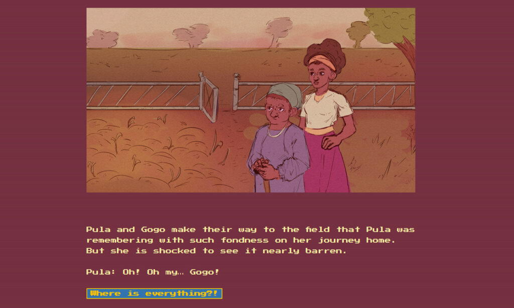 This interactive fiction game explores real-world climate challenges faced by small-holding farmers. Pula & Roots is a text-based narrative game where the player takes on the character of Pula, who has returned to her grandmother’s farm. The once productive small farm is now dry and nearly barren. Pula’s name means ‘rain’ in Sestwana (an indigenous South African language), as she was born just before the first spring rains. With her birth, her family planted a Umtiza tree, which would grow with her and remind her of her roots at the farm. But the rains have shifted and changed, and so too must the way of farming. Pula decides to help rejuvenate the farm.